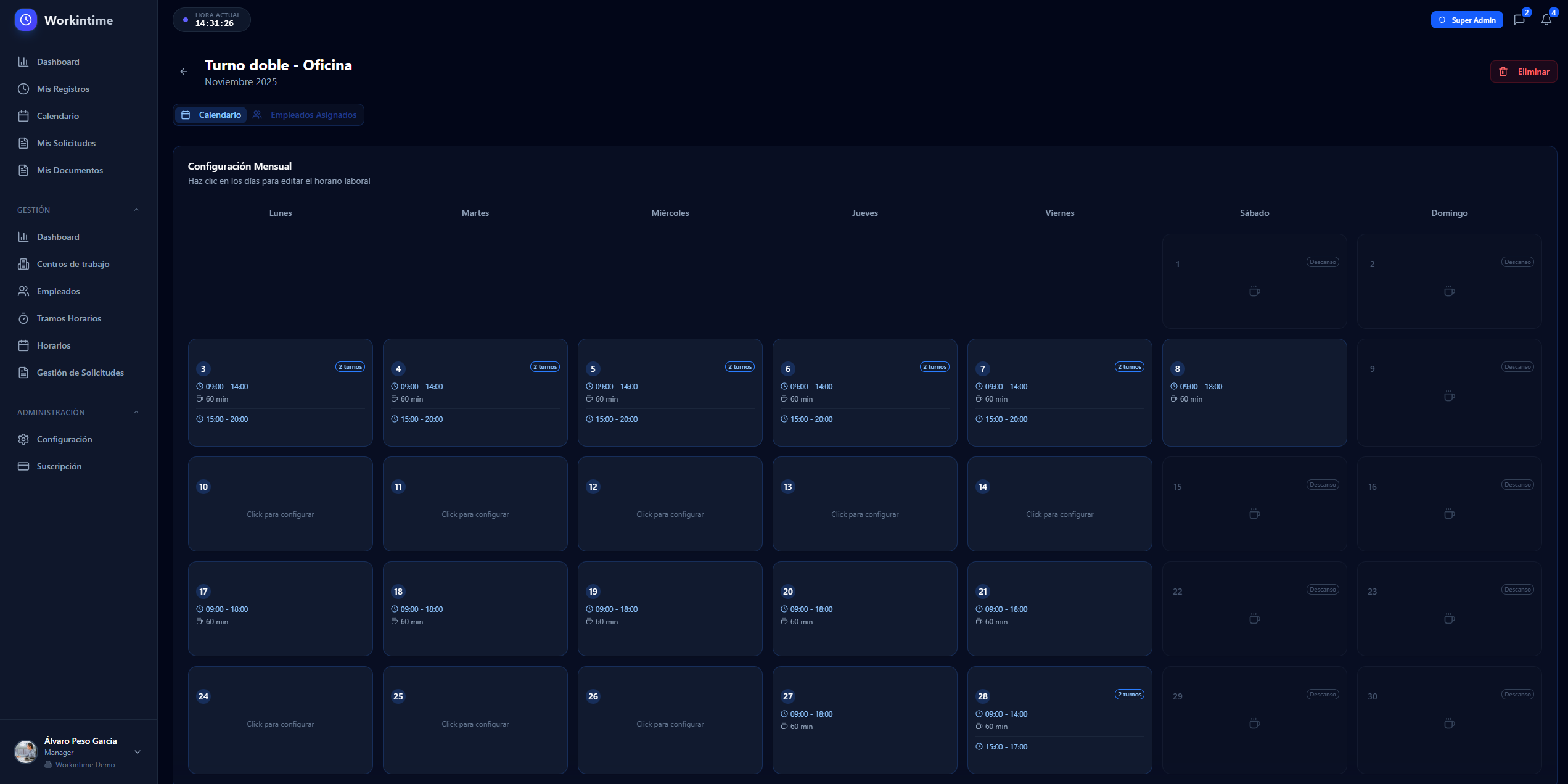 Gestiona múltiples empresas, centros de trabajo y turnos desde una única plataforma centralizada. Escalable de 10 a 10,000 empleados.