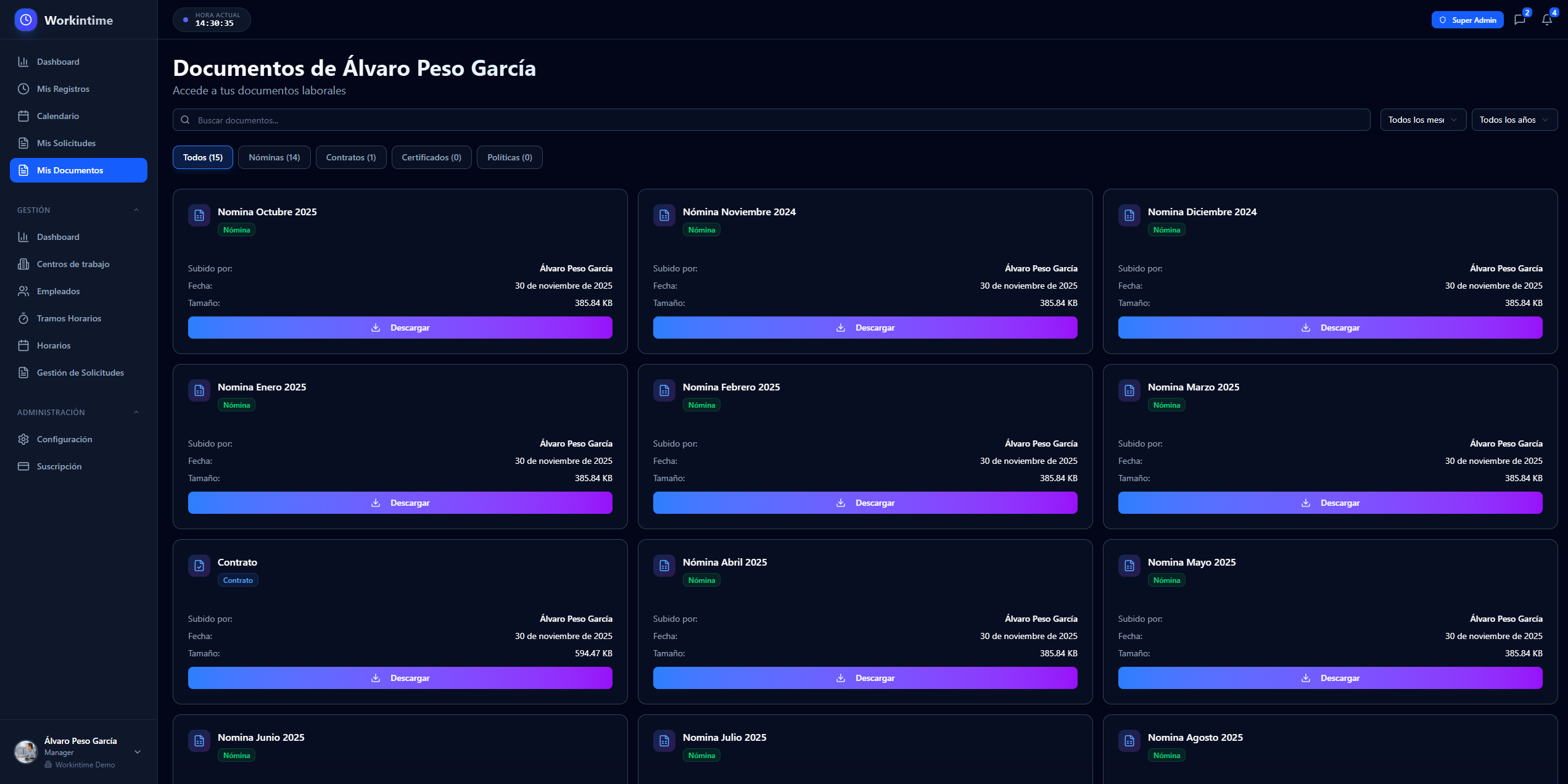 Workintime es la plataforma completa que automatiza fichajes en tiempo real con geolocalización, gestiona vacaciones inteligentemente, centraliza documentos de forma segura y genera reportes avanzados con IA.